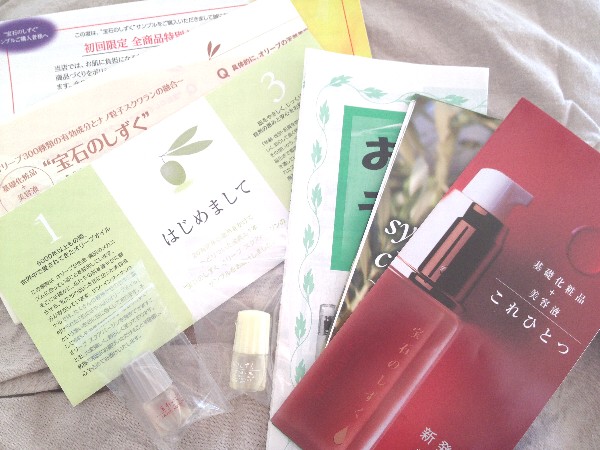 パンフレット数点と、「宝石のしずく」オリーブスクアバージンのサンプルに加え、「宝石のしずく」オリーブスーパーバージンオイルのサンプルも入っていました。